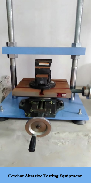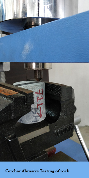 Cerchar Abrasive Index: The CERCHAR Abrasivity Test is a method to determine an index called CERCHAR Abrasivity Index (CAI) for the rock's abrasivity. The test measures the wear on the tip of a steel stylus having a Rockwell Hardness of HRC 55. A rock specimen, disc-shaped or irregular, is firmly held in the test apparatus. The stylus is lowered carefully onto the rock surface. While under a normal force of 70 N, the stylus is moved a total distance of 10.0 mm across the rock. The wear surface of the stylus tip is measured under a microscope to an accuracy of 0.01 mm
